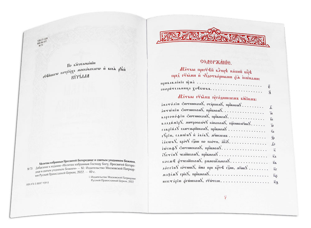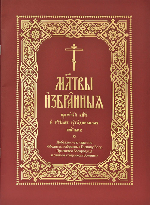 Издание «Молитвы избранныя Пресвятой Богородице и святым угодником Божиим» — это дополнение к вышедшей в 2020 году богослужебной книге «Молитвы избранныя Господу Богу, Пресвятой Богородице и святым угодником Божиим», сборнику молитв, предназначенному для совершения славлений и молебнов. Дополнительный выпуск содержит большинство молитв, утверждённых Священным Синодом Русской Православной Церкви за время, прошедшее после выхода основного издания. Новые молитвы изданы брошюрой на скрепе, в формат основной книги (292×214 мм), с идентичным оформлением: книга напечатана в две краски церковнославянским шрифтом крупного кегля на офсетной бумаге.