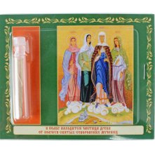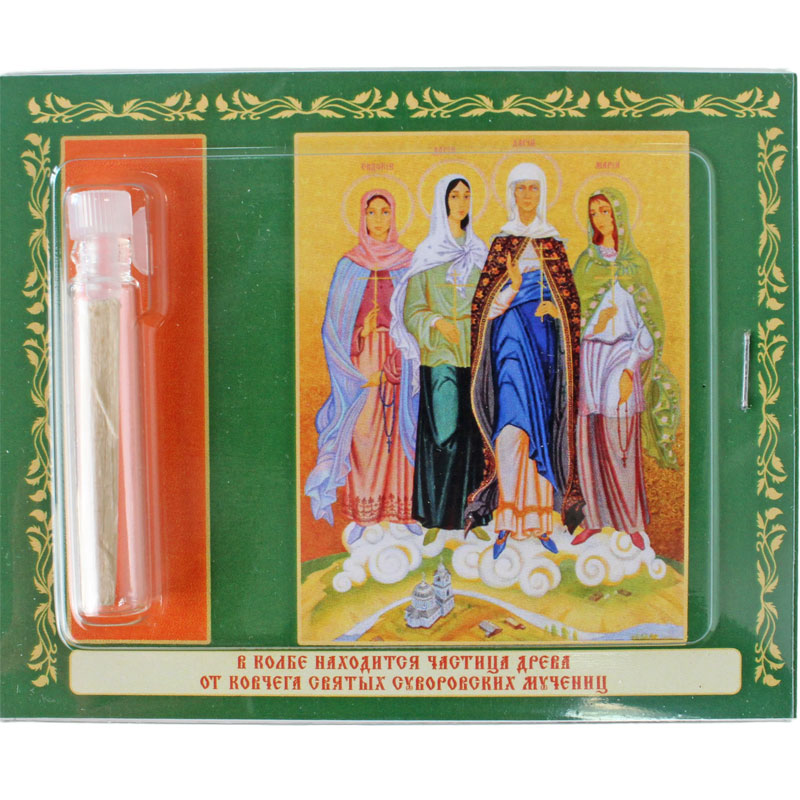 В наборе колбочка с частицей древа от ковчега святых Суворовских мучениц и икона с молитвой на обратной стороне.