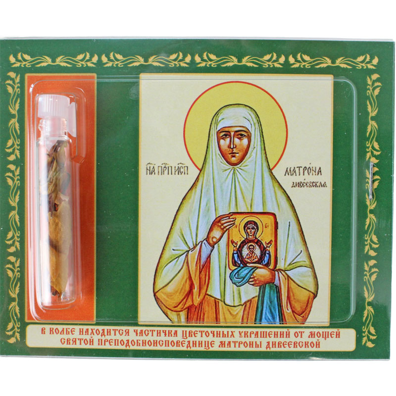 В наборе колбочка с частичкой цветочных украшений от мощей святой преподобноисповедницы Матроны Дивеевской и икона с молитвой на обратной стороне.
