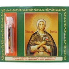 В наборе колбочка с частичкой цветочных украшений от мощей святой блаженной Пелагии Дивеевской и икона с молитвой на обратной стороне.