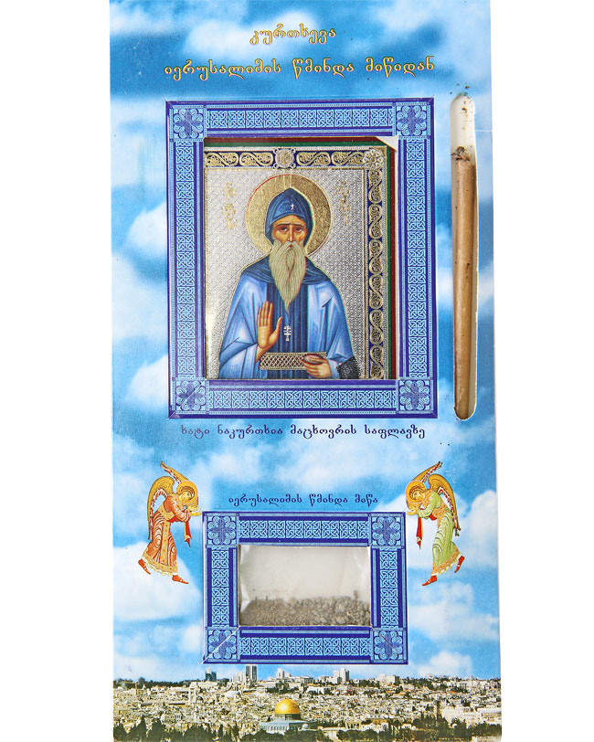В набор входит земля от могилы преподобного Давида, свеча, обожженная у мощей святого, и ламинированная икона, освященная на мощах преподобного Давида Гареджийского.