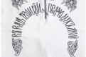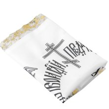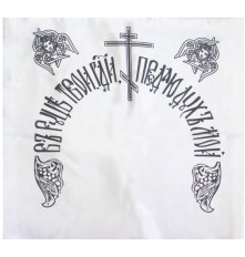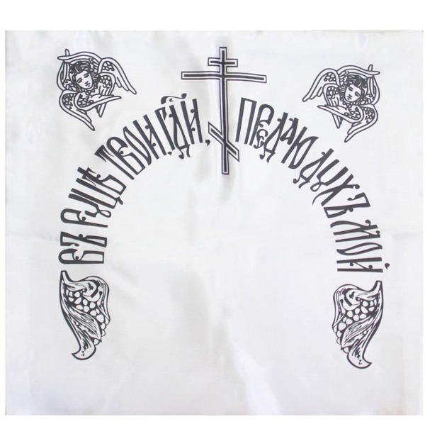 Наволочка для погребения, на ней имеется изображение херувимов, и напечатана надпись «В руцы твои, Господи, передаю дух мой».