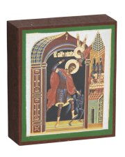 Икона на дереве. Техника изготовления: заготовка из липовой доски обрабатывается вручную, глубина ковчега 1,5-2,0 мм. После нанесения подготовительного грунта заготовка покрывается поталью (имитация сусального золота). Изображение иконы наносится современной светоотражаемой пигментной краской и защищается лаковым покрытием.