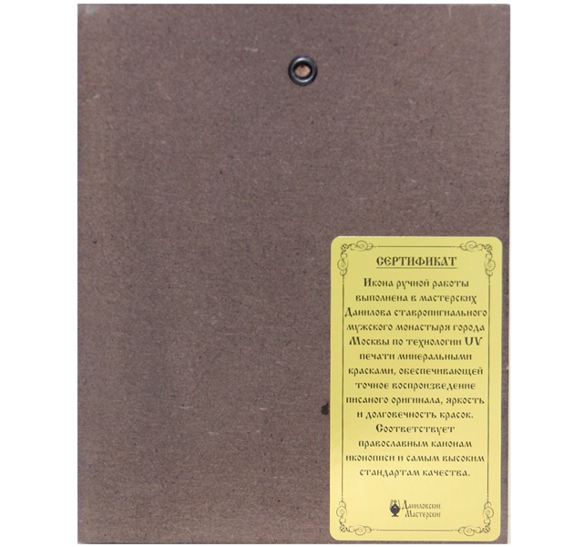 Икона ручной работы выполнена в мастерских Данилова монастыря г. Москвы по технологии печати минеральными красками, обеспечивая точное воспроизведение писанного оригинала, яркость и долговечность красок. На обратной стороне иконы отверстие для крепления к стене. Икона находится в подарочной коробке.