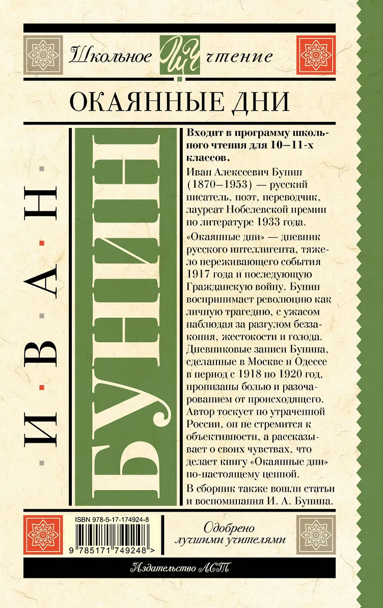 Входит в программу школьного чтения для 10–11 классов. Иван Алексеевич Бунин (1870–1953) — русский писатель, поэт, переводчик, лауреат Нобелевской премии по литературе 1933 года. «Окаянные дни» — дневник русского интеллигента, тяжело переживающего события 1917 года и последующую Гражданскую войну. Бунин воспринимает революцию как личную трагедию, с ужасом наблюдая за разгулом беззакония, жестокости и голода. Дневниковые записи Бунина, сделанные в Москве и Одессе в период с 1918 по 1920 годы, пронизаны болью и разочарованием от происходящего. Автор тоскует по утраченной России, он не стремится к объективности, а рассказывает о своих чувствах, что делает книгу «Окаянные дни» по-настоящему ценной. В сборник также вошли статьи и воспоминания И.А. Бунина.