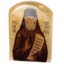 Икона настольная на подставке выполнена путем технологии фотопечати на камне под лаком.