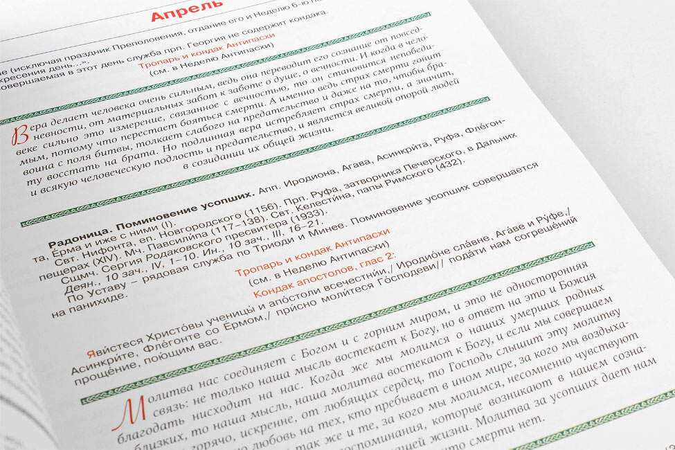 В специальных разделах календаря приводится традиционная справочная информация: о синодальных и общецерковных учреждениях, о епархиях и епископате Московского Патриархата, о зарубежных приходах Русской Православной Церкви, о духовных учебных заведениях.