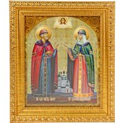 Икона в багетной рамке под стеклом. Литография с двойным тиснением. На обратной стороне имеется отверстие для крепления. Рамка иконы может оказаться в одном из четырех вариантов — светлая, золотистая, темная и коричневая с узором (фото прилагается). Материал рамки — пластик.