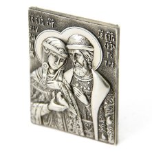 Икона имеет металлическую основу с нанесением серебра слоем 0,24 мкм, чернение, декоративно-художественная обработка, лакирование. На обратной стороне имеется двусторонний скотч.