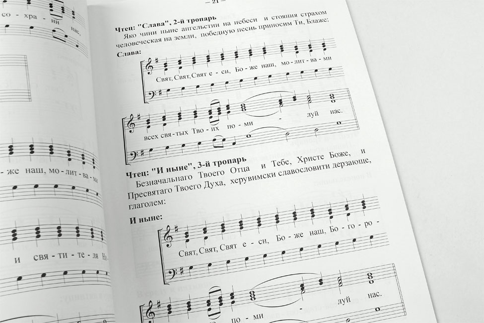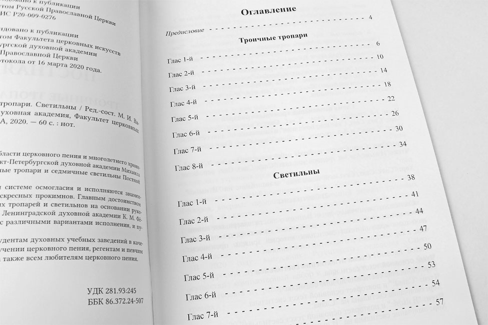 Указанные песнопения подчинены системе осмогласия и исполняются знаменным распевом по напеву утренних воскресных прокимнов. Главным достоинством сборника является изложение троичных тропарей и светильнов на основании рукописных гармонизаций преподавателей Ленинградской духовной академии К.М. Фёдорова и переложений М.И. Ващенко, с различными вариантами исполнения, публикующееся впервые.