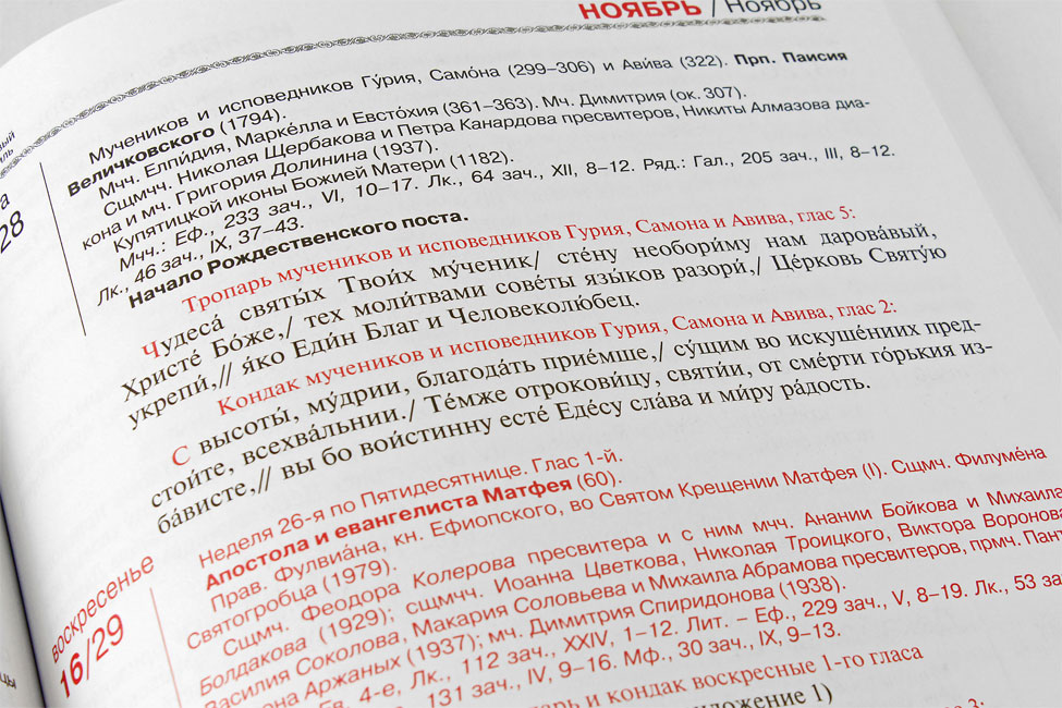 В календаре на каждый день церковного года приводятся тексты тропарей и кондаков, а в особых случаях и другие богослужебные тексты, тех праздников или святых, совершение служб которым предусматривается Богослужебными указаниями на 2025 год, выпускаемыми Издательством Московской Патриархии.