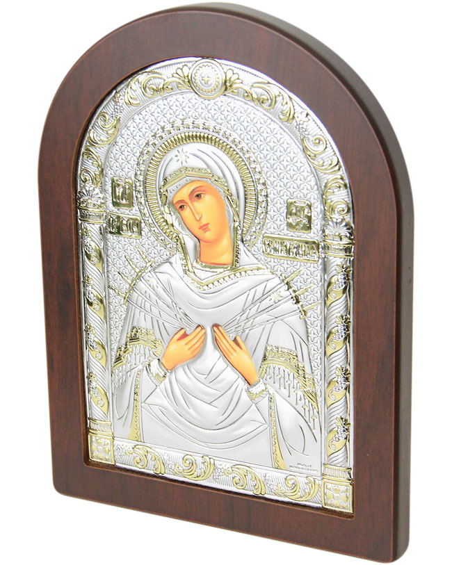 Материал: оклад — износоустойчивая сталь, покрыта листовым серебром; гальваника. Основа — МДФ, лак.