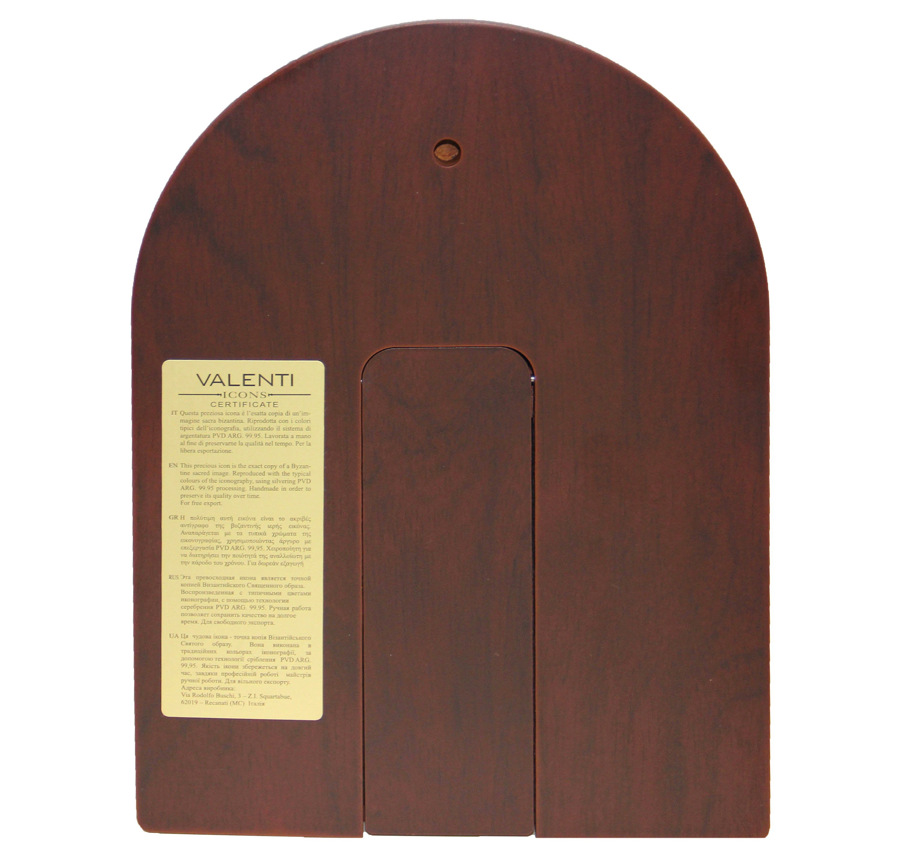 Икона ручной работы. Лик иконы изготавливается полностью, включая рисунок иконы под окладом. Используется метод шелкографии, а также трафаретной объемной печати. На оборотной стороне иконы имеется отверстие (для крепления к стене) и подставка, а также сертификат. Икона упакована в подарочную коробку и завернута в тканевый футляр.
