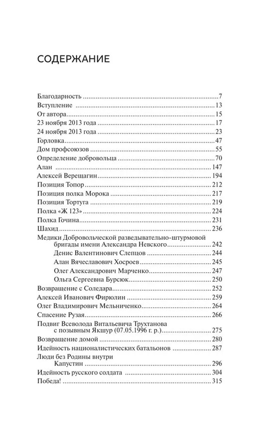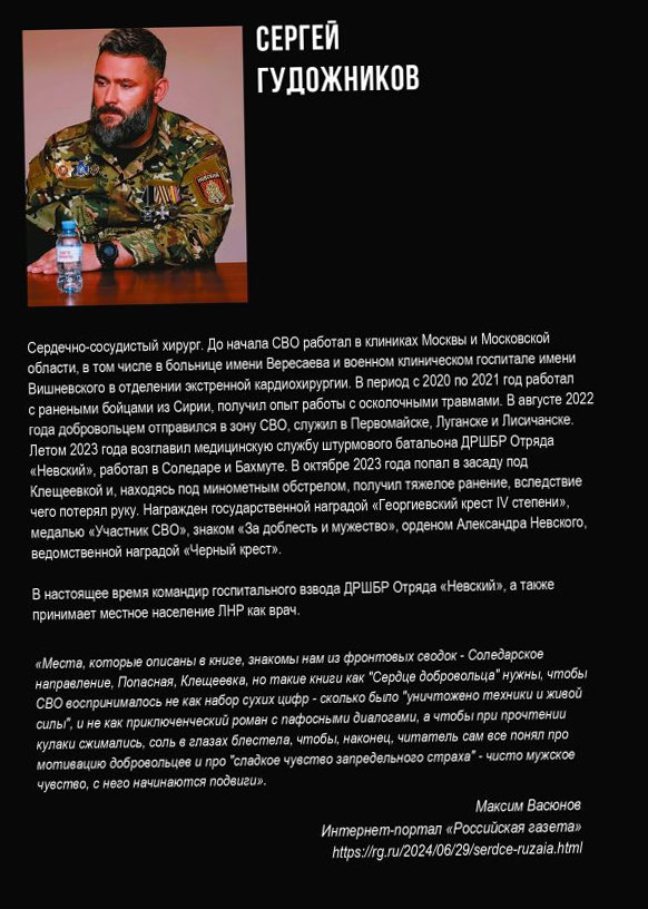 Книга «Сердце добровольца» описывает историю столич- ного врача-хирурга, который, не задумываясь ни на минуту, сме- нил белый халат на бронежилет и рюкзак тактического медика. Что им двигало? Патриотизм, глубокая и беззаветная любовь к своей Родине. Ему посчастливилось служить начальником медицинской службы Второго штурмового батальона в одной из самых сильных, патриотичных, идейных добровольческих разведывательно-штурмовых бригад. Бригаде имени Святого Благоверного князя Александра Невского. Это столпы право- славия, исполины государства Российского, ведущие каждод- невную борьбу с нацистской заразой, получившей новую жизнь на территориях Незалежной. Русские богатыри, которые свои- ми делами, поступками доказывают истинную принадлежность к великой Русской нации.