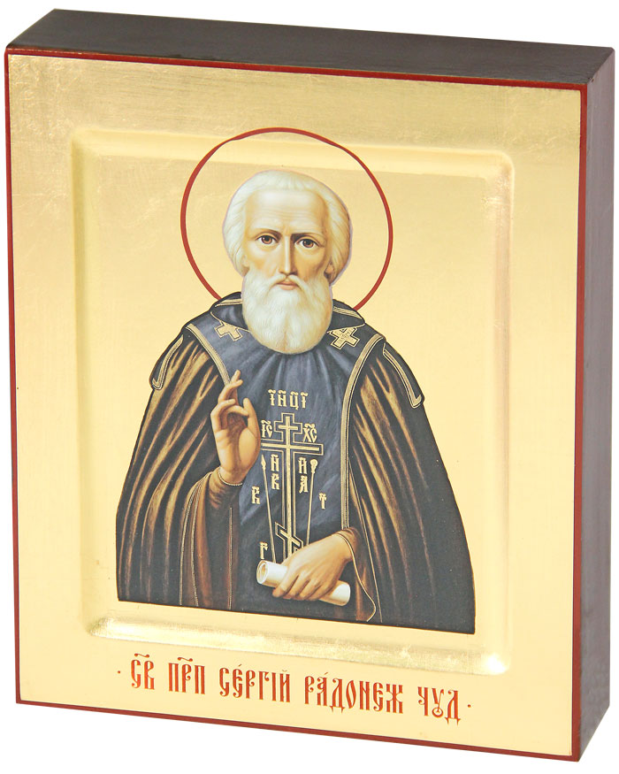 Икона на дереве, образ выполнен в технике литографии, поверхность фона покрыта вручную поталью (имитация сусального золота). На оборотной стороне имеется отверстие для крепления к стене.