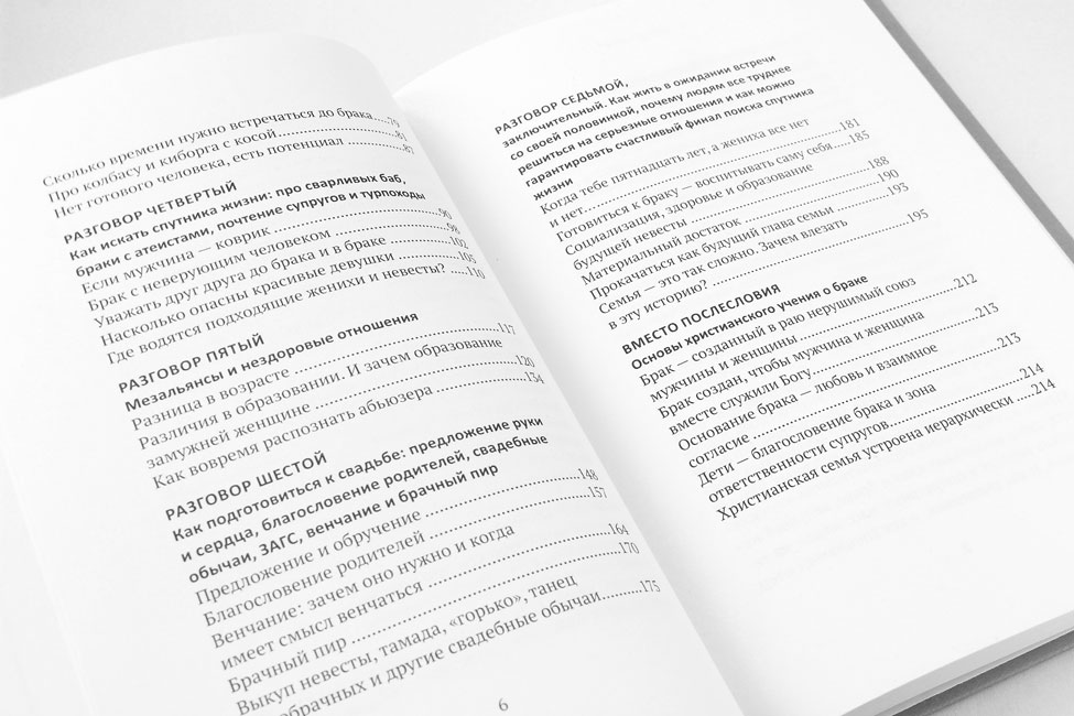 В ходе семи бесед авторы дают ответы на важные вопросы: где в интернет-эпоху искать спутника жизни, как понять, что человек тебе подходит, не впадая в грех, сколько времени нужно встречаться до брака, как вовремя распознать «подводные камни» в отношениях. Хотя эта книга и не является пошаговым руководством к действию, она расставляет четкие ориентиры для всех, кто стремится обрести семейное счастье, вне зависимости от возраста потенциальных женихов и невест.