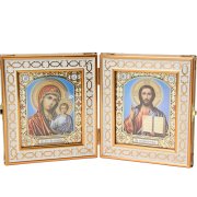 Складень двусторонний ручной работы с образом Казанской Божией Матери и Спасителя из искусственной кожи. С внутренней строны иконы Казанской Божией Матери и Спасителя выполнены в технике литографии с двойным тиснением. Края складня украшены металлическими узорными уголками.