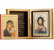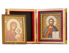 Складень деревянный двойной с иконами Спасителя и Казанской Божией Матери. Обтянут бумвинилом с золотым тиснением. Иконы съемные, находятся под стеклом в багетных пластиковых рамках. Лики - полиграфическая печать с ламинированием.