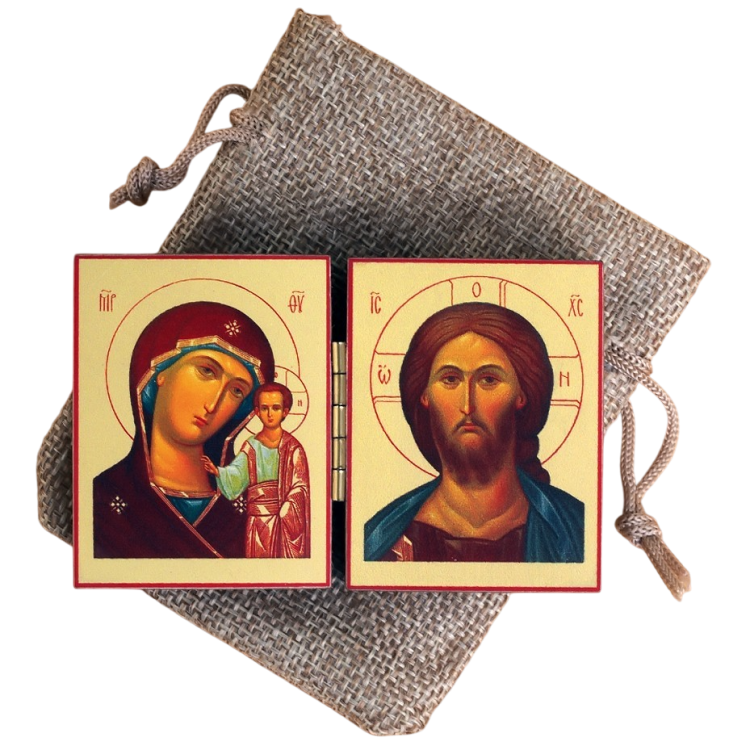 Деревянный дорожный складень небольшого размера состоит из двух икон - Спасителя и Казанской иконы Божией Матери, соединенных между собой петлями. Складень раскрывается на полный разворот, в сложенном виде убирается в холщовый мешочек.
