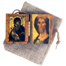 Деревянный дорожный складень небольшого размера состоит из двух икон - Спасителя и Владимирской иконы Божией Матери, соединенных между собой петлями. Складень раскрывается на полный разворот, в сложенном виде убирается в холщовый мешочек.