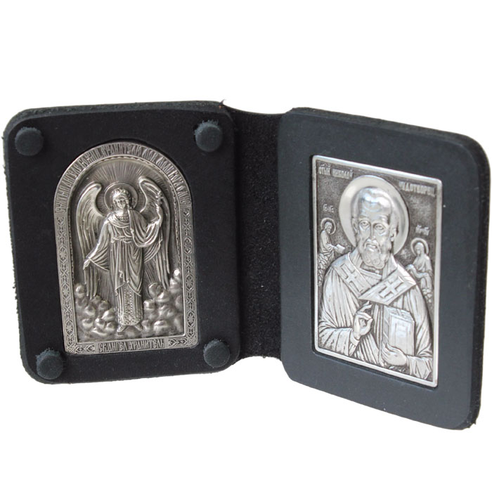 Складень двойной кожаный с иконами Ангел Хранитель и Николай Чудотворец