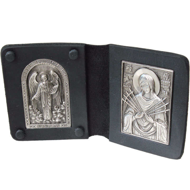 Складень из искусственной кожи с тиснением. Икона изготовлена из меди с гальваническим посеребрением.