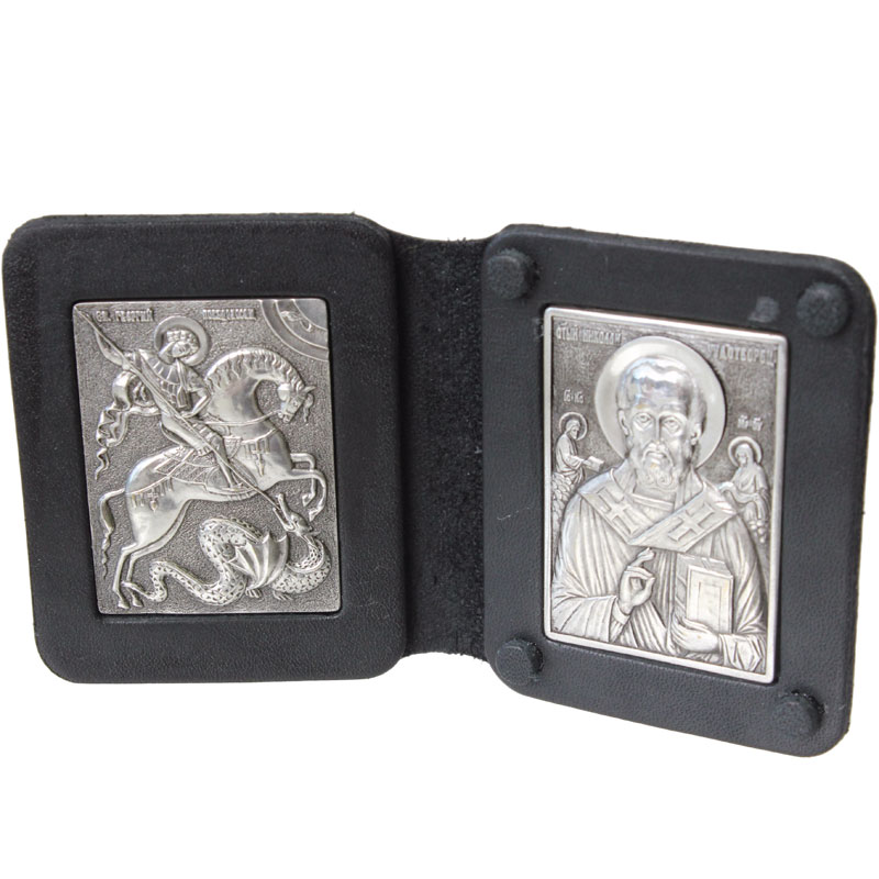 Складень двойной из искусственной кожи с тиснением. Иконы изготовлены из меди с гальваническим посеребрением.