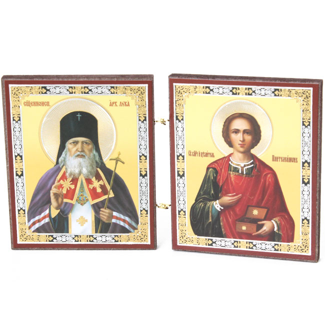 Складень — складная икона, состоящая из двух (диптих) частей - образы святителя Луки Крымского и целителя Пантелеимона. Литография на дереве с двойным тиснением.
