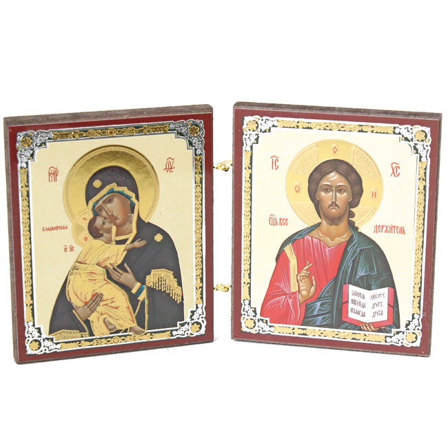 Складень — складная икона, состоящая из двух (диптих) частей - образы Владимирской иконы Божьей Матери и Господа Вседержителя. Литография на дереве с двойным тиснением.