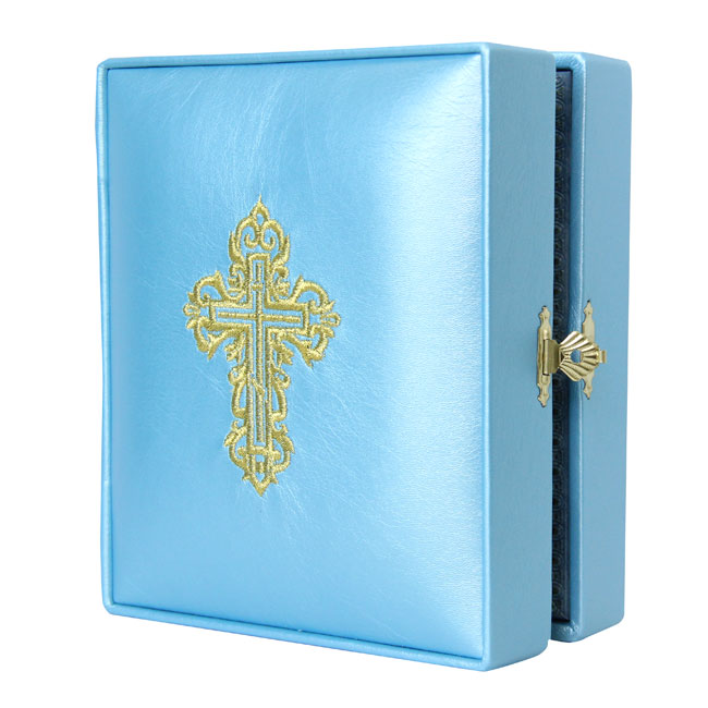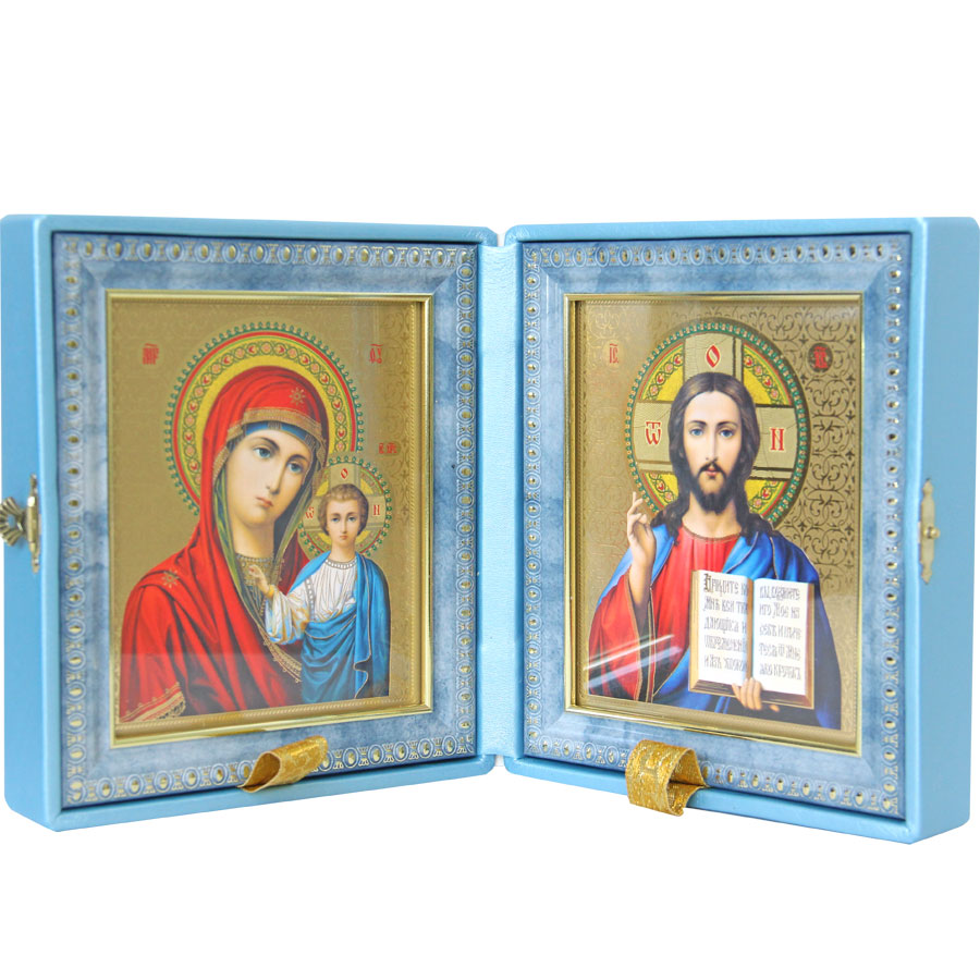 Складень Казанская БМ, Спаситель (голубая экокожа, размер иконы 12,5 х 14,5 см)