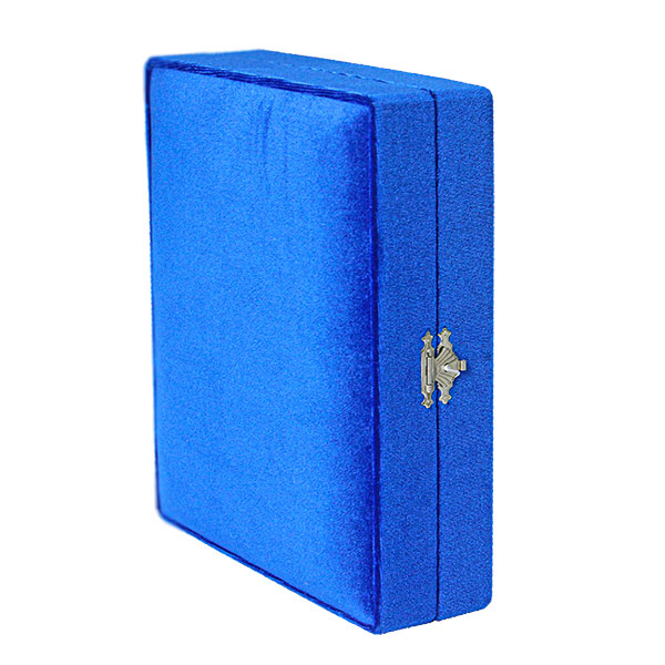 Двойной футляр покрыт бархатом. Створки подвижные, футляр закрывается с помощью металлической застежки.
