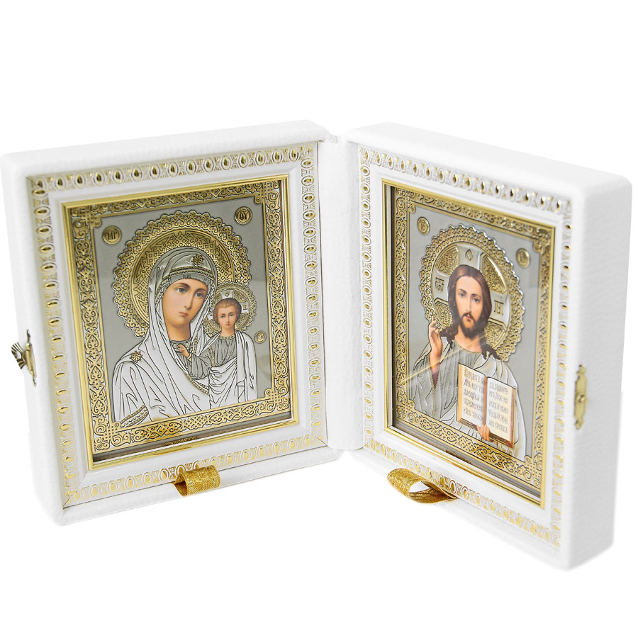 Складень ручной работы «Венчальная пара» с иконами Божия Матерь «Казанская» и «Господь Вседержитель». Венчальной парой благословляют жениха и невесту, вступающих в брак.