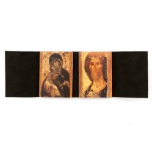 Складень в замше на завязках, состоит из двух икон: Спасителя и Божией Матери «Владимирская». Небольшой и компактный, в собранном виде легко помещается в нагрудный карман или портмоне, подходит для дальних поездок. Иконы выполнены из дерева (фанера), изображение нанесено светостойкими красками.