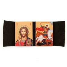 Складень в замше на завязках, состоит из двух икон: Спасителя и святого великомученика Георгия Победоносца. Небольшой и компактный, в собранном виде легко помещается в нагрудный карман или портмоне, подходит для дальних поездок. Иконы выполнены из дерева (фанера), изображение нанесено светостойкими красками.