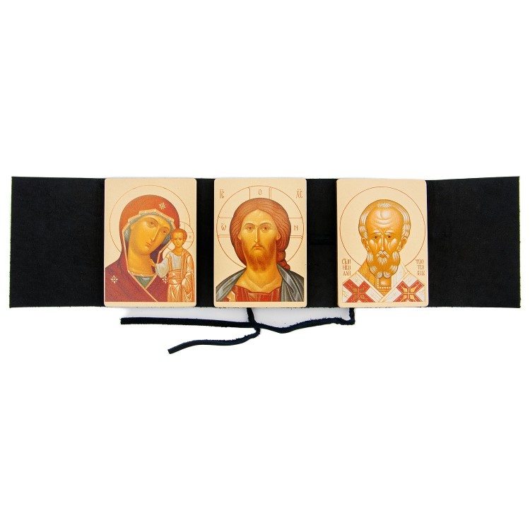 Складень в замше на завязках, состоит из трех икон: Спасителя, Казанской Божией Матери и святителя Николая Чудотворца. Небольшой и компактный, в собранном виде легко помещается в нагрудный карман или портмоне, подходит для дальних поездок. Иконы выполнены из дерева (фанера), изображение нанесено светостойкими красками.