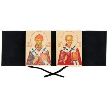 Складень в замше на завязках, состоит из двух икон: святителя Николая Чудотворца и святителя Спиридона Тримифунтского. Небольшой и компактный, в собранном виде легко помещается в нагрудный карман или портмоне, подходит для дальних поездок. Иконы выполнены из дерева (фанера), изображение нанесено светостойкими красками.