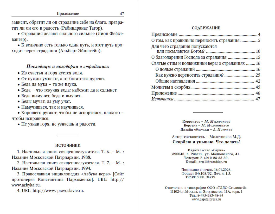 Книга содержит многочисленные высказывания святых отцов и учителей Церкви о страданиях, а также несколько молитв, читаемых во время душевной или телесной тяготы.