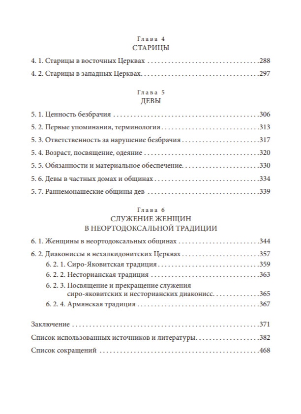 Книга посвящена эволюции женского церковного служения, начиная с евангельских времен и заканчивая Средневековьем. На основании широкого круга письменных и эпиграфических источников рассмотрены статус и служение разных групп женщин в Древней Церкви на территории Средиземноморья: пророчиц, вдов, диаконисс, стариц и дев, а также женщин в неортодоксальных общинах и нехалкидонитских церквах.