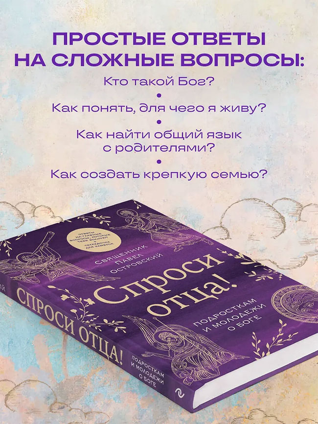 В своей новой книге священник Павел Островский — настоятель Георгиевского храма в Нахабино — обращается к подросткам и молодежи, отвечая на их вопросы и раскрывая глубокий смысл самого понятия веры. Книга «Спроси отца!» основана на беседах Павла Островского с подростками — теми, кто только вступает на путь Православия и для кого многие вопросы о жизни и вере вызывают противоречивые чувства и эмоции. Как и предыдущие книги отца Павла «Первые шаги к Богу», «Неизвестная Библия» и «Детям о Боге» эта книга — такой же добрый разговор с теми, кто хочет прорваться сквозь свое смятение к открытости сердца. С поистине отцовским теплом и обезоруживающей честностью священник Павел Островский делится сокровенной мудростью Святого Евангелия с молодыми и неравнодушными к вопросам веры людьми.