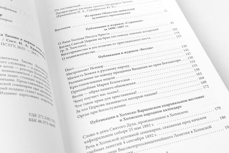 В сборник вошли печатные труды святителя Тихона (Беллавина), написанные в начальный период его церковного служения — в качестве преподавателя Псковской духовной семинарии, а затем — ректора Холмской духовной семинарии. Книга дает возможность познакомиться с богословским наследием будущего святителя, его пониманием задач, стоящих перед духовной школой, ее преподавателями и воспитанниками. Представленные тексты передают уникальную атмосферу жизни Холмской семинарии при архимандрите Тихоне и духовный облик пастыря, который позднее станет известен как «самый добрый епископ» Русской Церкви.