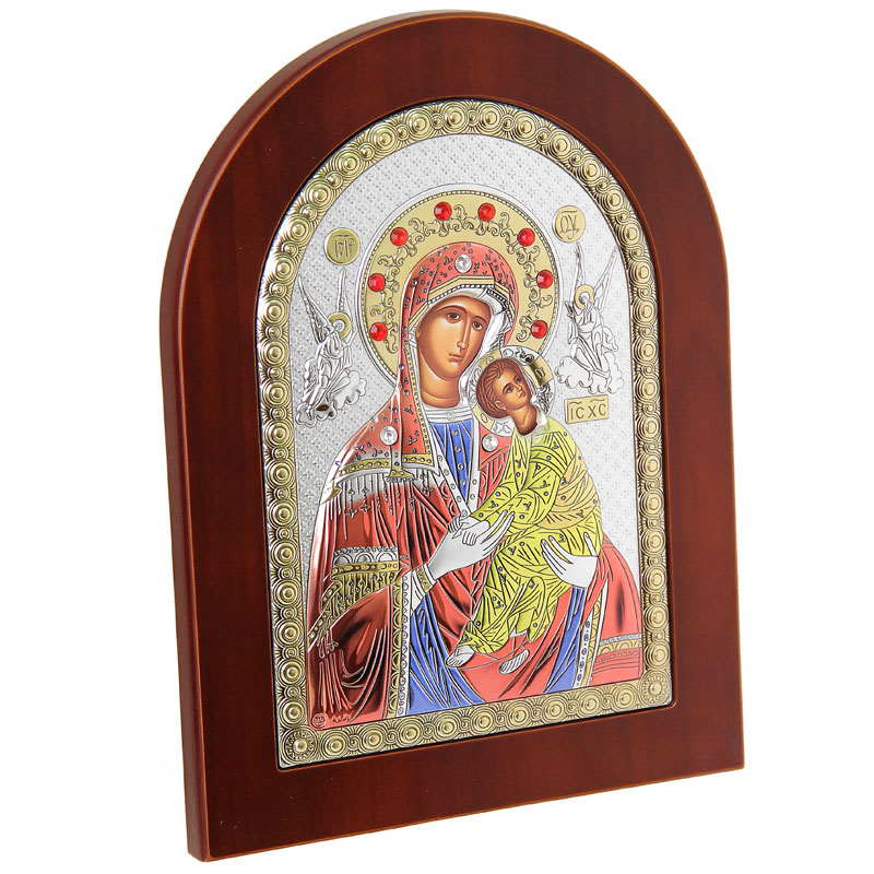 Икона Божией Матери «Страстная», выполнена в стиле греческого письма, ручной работы. Изготовлена с использованием метода шелкографии, а также трафаретной объемной печати. Металлическая пластина состоит из листа алюминия (он получает поверхностную обработку с помощью PVD технологии нанесения тонкого слоя серебра и золота) и покрыта лаком. На оборотной стороне иконы имеется подставка и сертификат о подлинности письма.