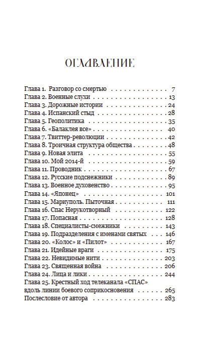Через главы, наполненные яркими эпизодами — от военного духовенства до героев с именами Святых — раскрывается не только действующая реальность, но и глубинные вопросы морали, веры и судьбы народа. Особое место занимают рассказы о крестном ходе телеканала «СПАС» вдоль линии фронта, служении военных священников и людях, которые своим примером вдохновляют и учат быть сильными в испытаниях.