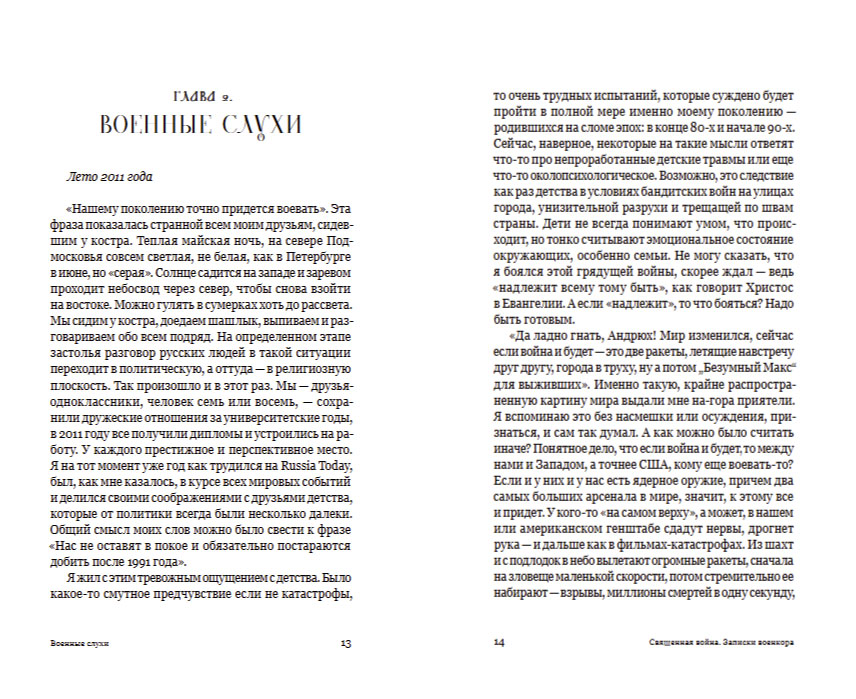 «Священная война. Записки военкора» — откровенный и глубокий взгляд на современную войну, рассказанный через призму личных историй, фронтовых будней и духовных исканий. Автор ведёт читателя от первых разговоров со смертью до переживаний на линии боевого соприкосновения, раскрывая сложные грани конфликта, от геополитики до человеческих судеб.