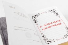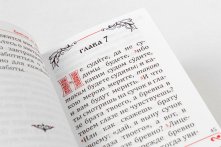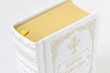 Святое Евангелие на русском языке, карманного формата, в кожаном переплете с блинтовым тиснением и с тиснением золотой фольгой. Текст напечатан уменьшенным шрифтом в два цвета на качественной офсетной бумаге, использован золотой обрез блока, форзац выполнен из дизайнерской бумаги. Для удобства книга снабжена ленточкой-закладкой.