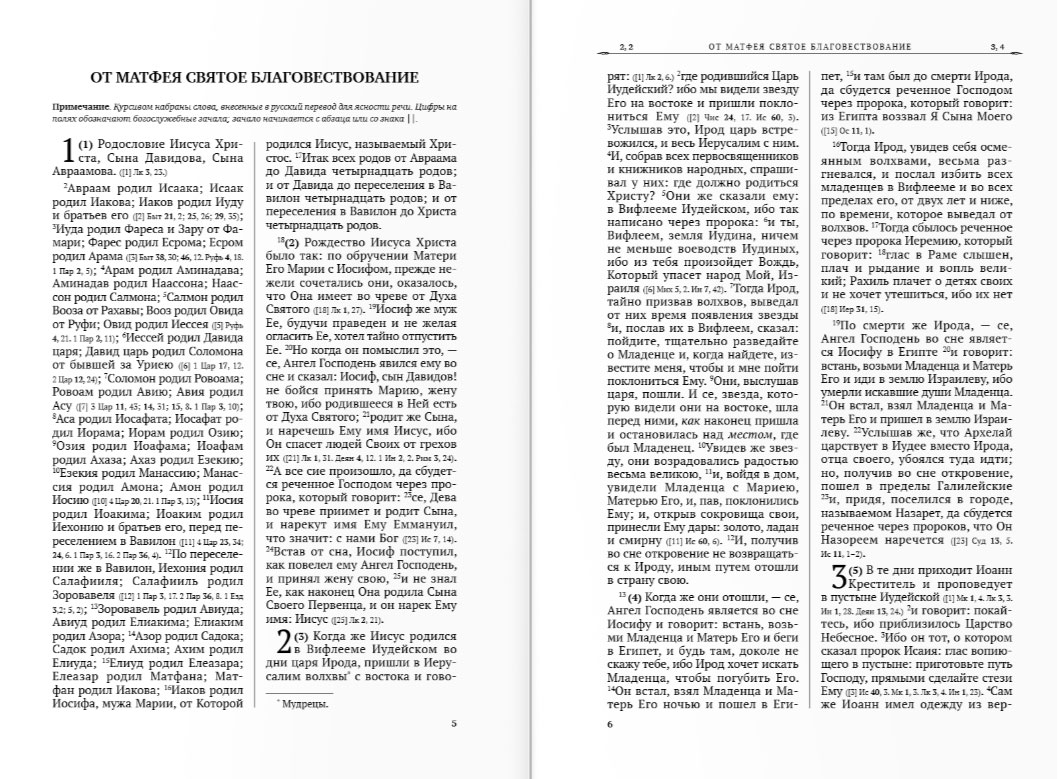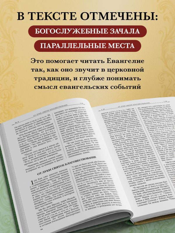 Книга «Святое Евангелие. Русский синодальный перевод» содержит текст Четвероевангелия на русском языке с добавлением справочных материалов: указатель Евангельских и Апостольских чтений церковных, последовательность Евангельских событий по четырем евангелистам, последовательность событий по книге Деяний святых Апостолов, денежные единицы в Новом Завете, карты Палестины и Иерусалима времен Христа.