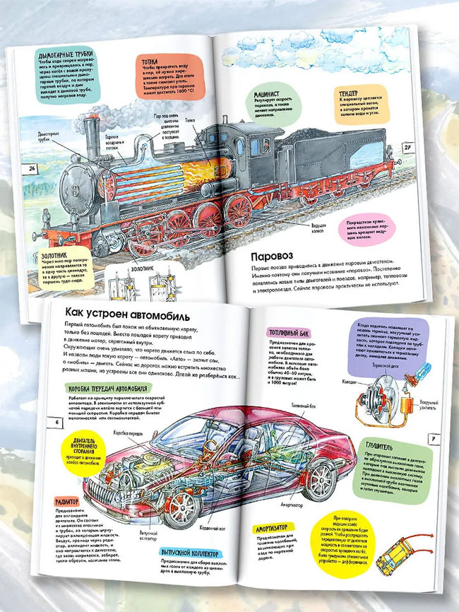 Книга «Техника» из серии «Детская энциклопедия» откроет перед читателем увлекательный мир различных видов транспортных средств. Под одной обложкой собраны удивительные факты об автомобилях, поездах, самолётах и кораблях. Читателю предстоит узнать, как устроен железнодорожный вокзал, какая техника помогает подготовить самолёт к взлёту, как устроена система безопасности автомобиля и множество других любопытных деталей. Красочные иллюстрированные памятки помогут запомнить знаки дорожного движения, названия разных типов автомобилей и кораблей. Великолепные иллюстрации техники в разрезе покажут, как устроены автомобиль, пассажирский самолёт и паровоз.