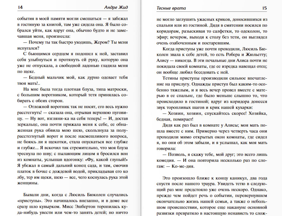 «Тесные врата» — во многом автобиографическая повесть, в которой рассказывается история Жерома и Алисы — кузенов, влюбленных друг в друга, но вынужденных отказаться от своих чувств в пользу нравственности и благодетели.