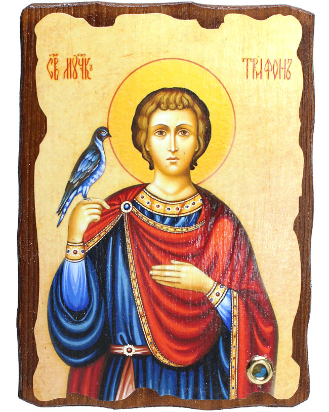 Святой мученик Трифон — один из особо почитаемых святых, известный своей милосердной жизнью и чудесами как при жизни, так и после кончины; он претерпел жестокие мучения за веру, но оставался непоколебим. Его память празднуется 14 февраля, и к нему обращаются с молитвами о помощи в различных нуждах: охотники и рыболовы просят об успешной добыче, виноградари — о богатом урожае, люди молятся об избавлении от грызунов и вредителей, при поиске работы и жилья, в семейных трудностях, а также о защите от неправедного обвинения и злых духов.