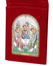 Серебряная поверхность покрыта специальным защитным лаком, который предохраняет от внешних факторов и царапин и не дает тускнеть со временем. Оклад сделан из алюминиевой пластины с рельефным рисунком и покрыт серебром 999 пробы с помощью термомеханического метода «плакирование» (нанесение тонкого листа на поверхность). Основа бархатного складня - картон.