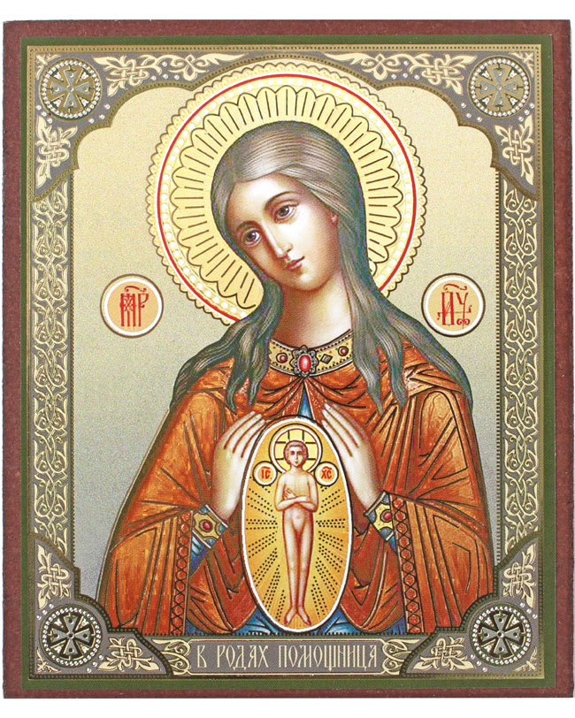 В родах помощница икона Божией Матери на МДФ (10,3 х 12,3 см)